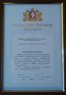 ООО «ЛСР. Строительство-Урал» награждена благодарственным письмом губернатора Свердловской области.