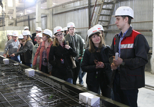 Для наших гостей было организовано две экскурсии по самым эффектным цехам завода: во втором цехе гости увидели автоматическую линию по производству объемных каркасов треугольного сечения, многопрофильный центр для обработки арматуры, автоматические линии по производству плоских каркасов типа «лесенка» и сеток. В седьмом цехе гостям были продемонстрированы линии, которые используются главным образом для производства трехслойных, наружных и внутренних панелей, а также плит перекрытий. А в восьмом цехе была показана работа кассетных машин для производства несущих стеновых панелей. Особый интерес вызвал склад готовой продукции: именно там гости увидели и потрогали красивые ровные изделия, из которых будут возведены, возможно, их будущие дома.