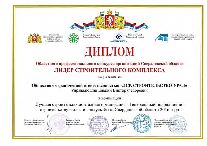 По итогам конкурса в номинации «Лучшая строительно-монтажная организация- Генеральный подрядчик по строительству жилья и соцкультбыта Свердловской области 2016 года» победу одержала «ЛСР. Строительство-Урал». Всего представителям строительной отрасли были вручены награды по 25 номинациям.