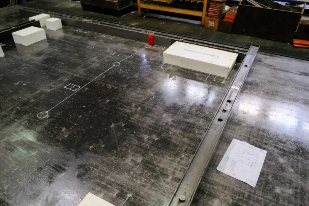 Это форма (палета) для заливки плиты. Вся разметка сделана роботом по чертежам конструктора